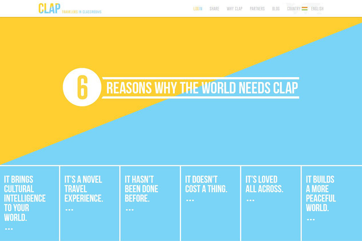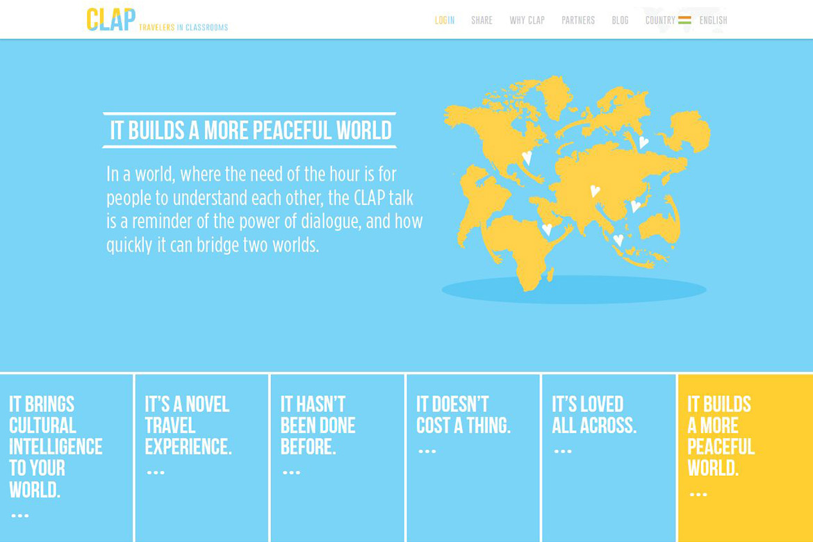 Clap Travelers in Classrooms – portal connects international travelers with local schools to inject a dose a cultural quotient in classroom learning. We developed a sleek one page website reflecting the designs provided by Clap. The website, developed with HTML5, SASS – a preprocessor for CSS, incorporates features such as click to reveal sections, sliders with swipe gestures, modal windows and more.
