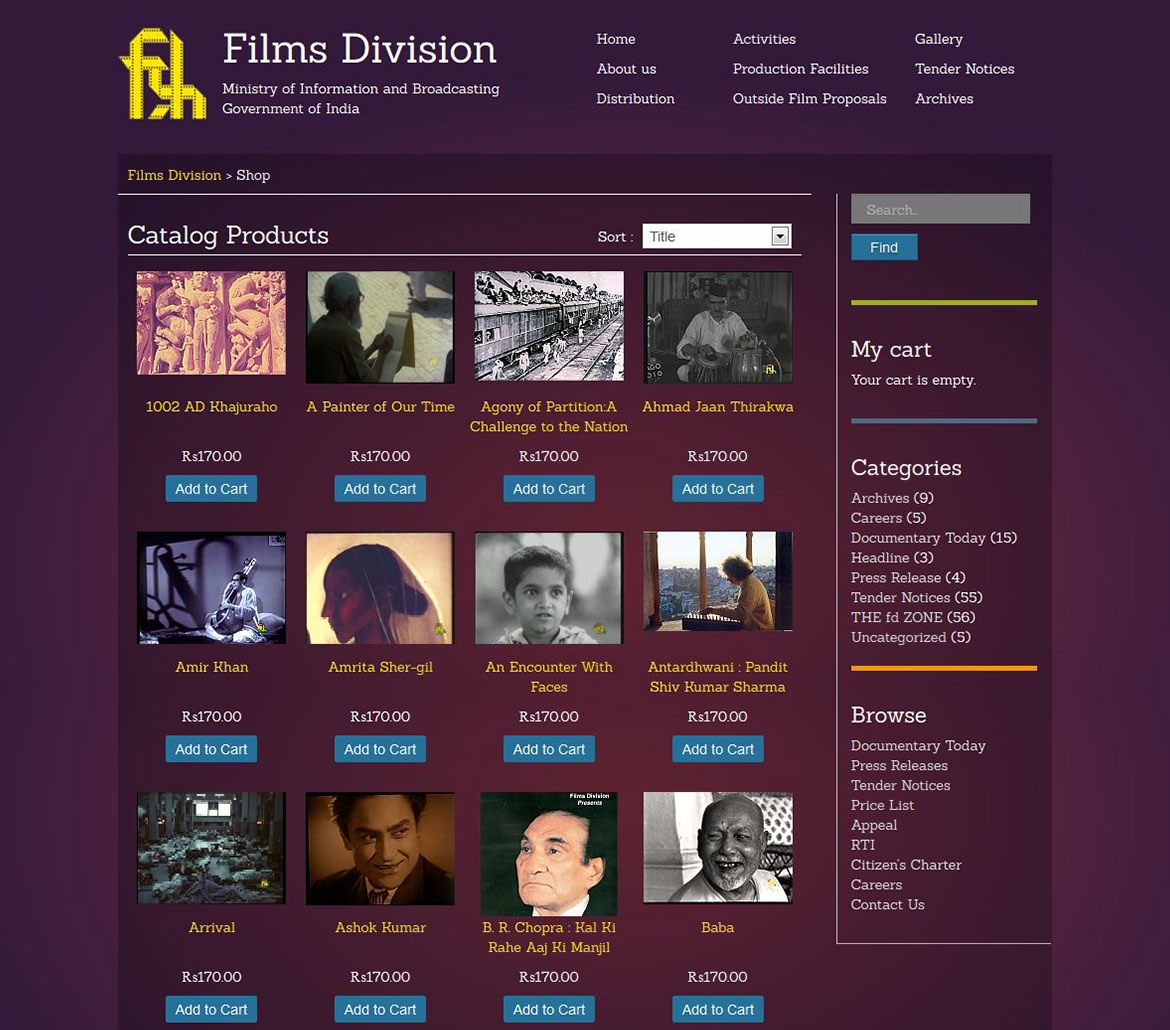 The Films Division of India project is based on WordPress as a tool well integrated into a contemporary responsive HTML5 based design, it facilitates the need of a Content Management System [CMS] for the organisation to keep up to date various Tenders and Documentaries they publish along with their Archives which is also available to purchase on their online store developed on top of WordPress itself as an E-Commerce portal thus enabling a unified system where based on various user levels content as well as orders can be managed.