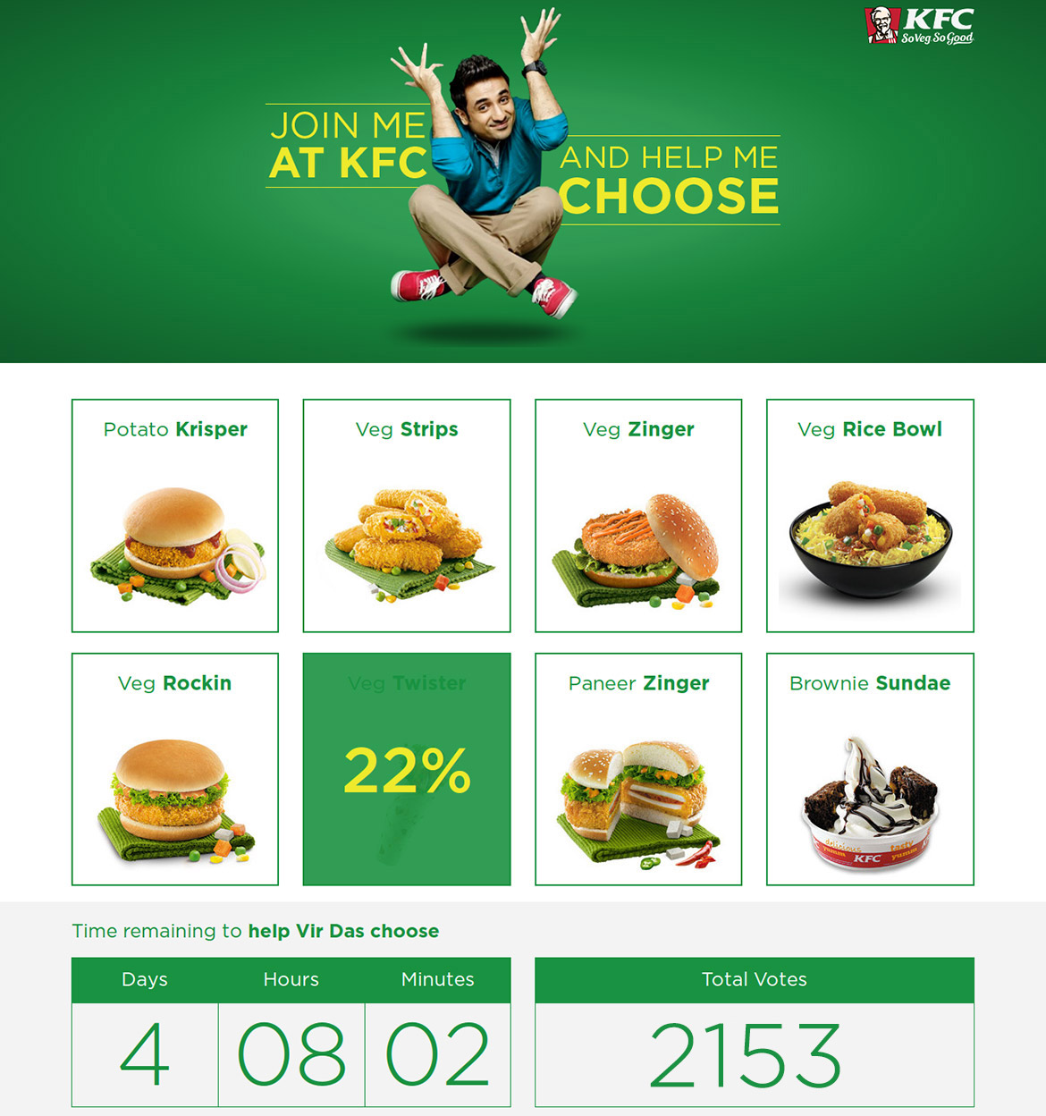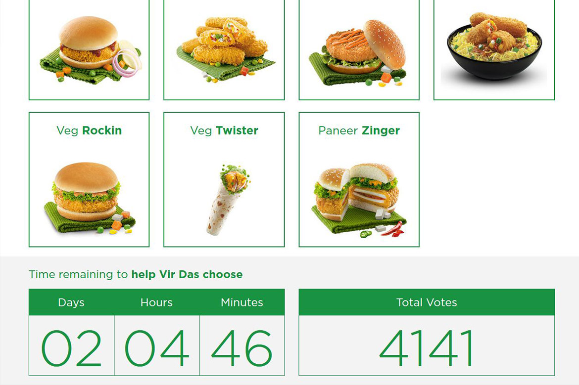 KFC’s campaign was to ask food lovers to help Vir Das choose a dish from a list of KFC’s veg delicacies. The campaign was promoted via KFC’s twitter and facebook handles. “Help Vir Das choose” microsite allowed visitors to vote on their favorite Veg item from KFC. A real time ranking system displayed the number of votes on each food item.