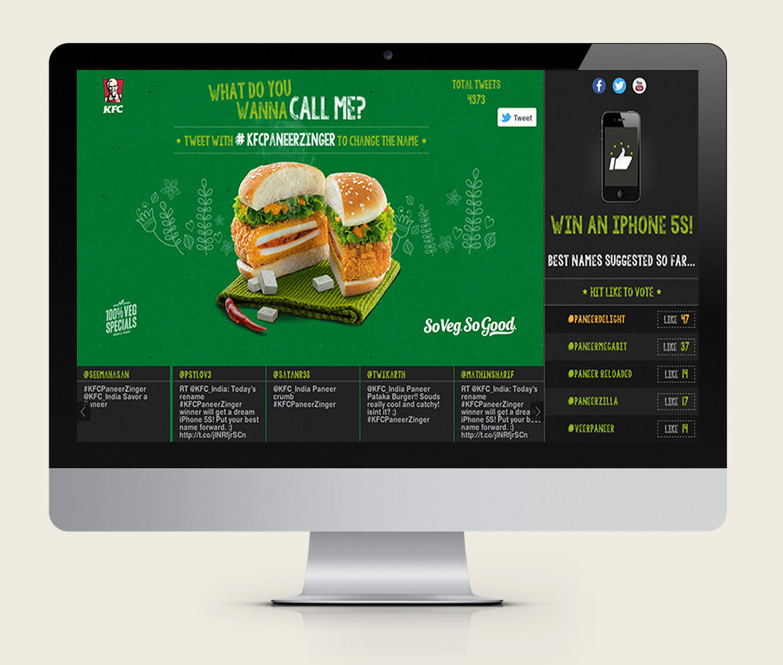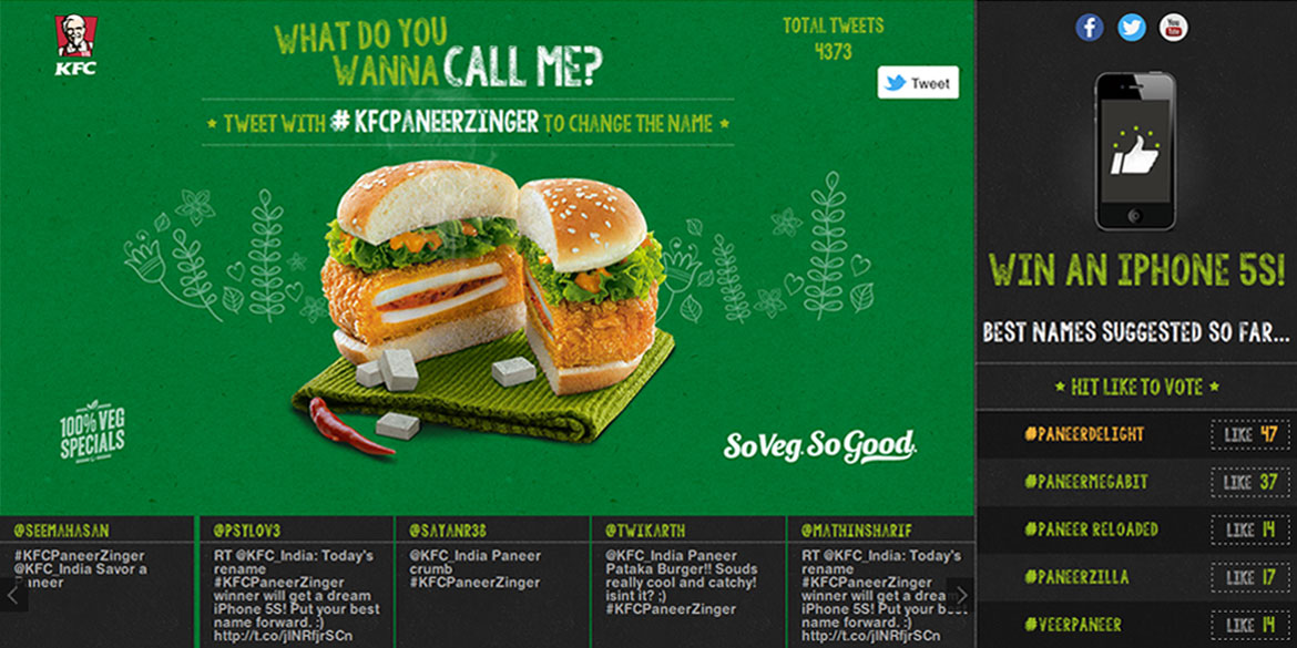 Project Objective:To create an instant buzz about the newly launched KFC Paneer Zinger Burger on twitter. A microsite fetching tweets with a certain hashtag asking viewers to suggest a name for the burger. A real time voting system to decide on the winning tweet.