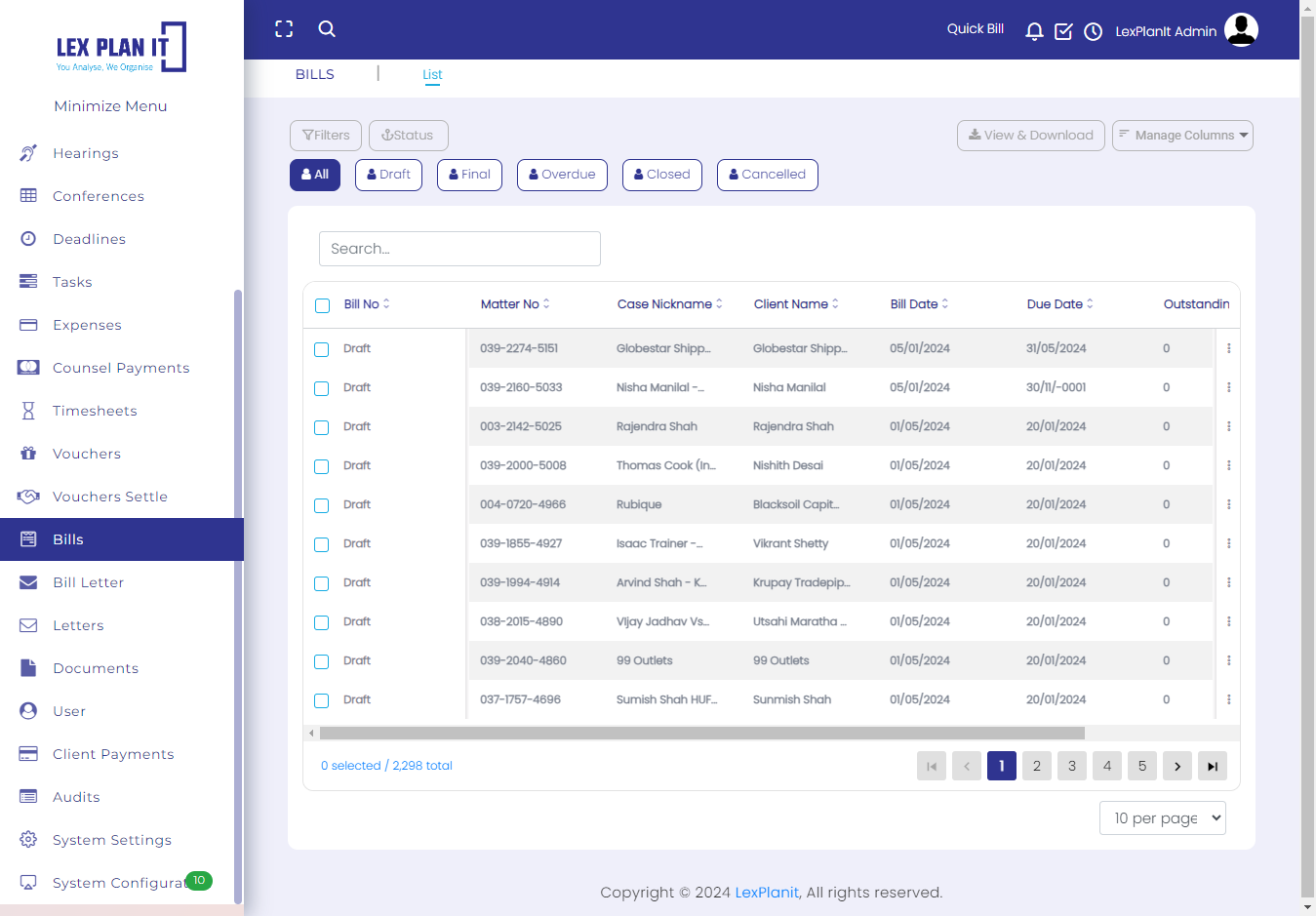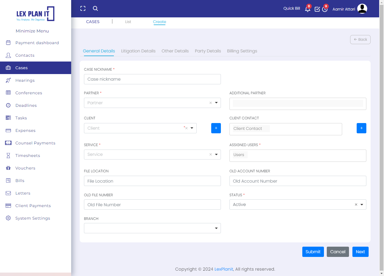 Lexplanit is a web-based enterprise system built for managing operations of a law firm which includes cases, activities, timesheets, documentations and billing.